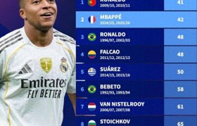 西甲40球速度之争:C罗41场称王,姆巴...